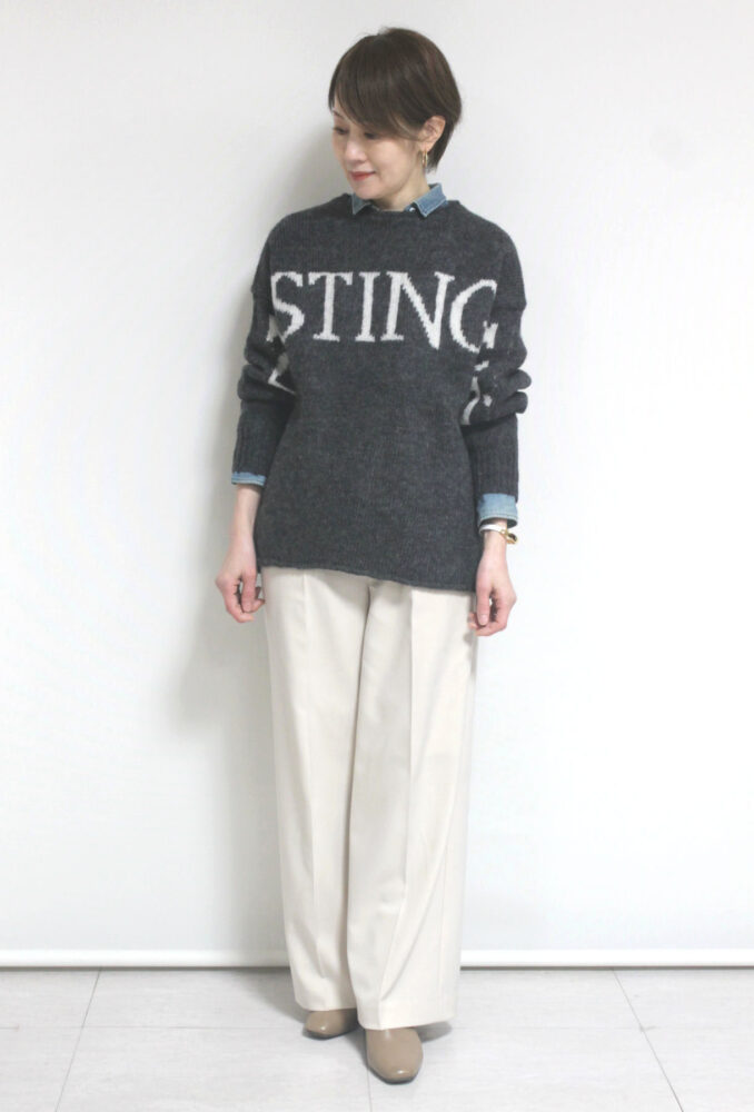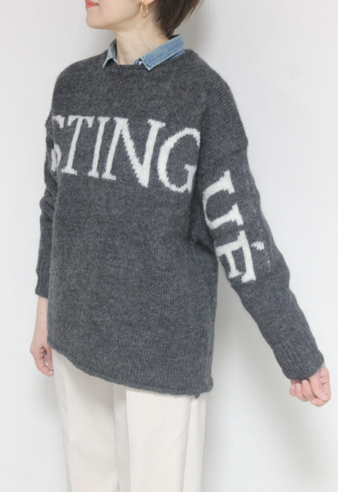 マリードール(MARIED'OR)ジャガードロゴプルオーバー。身幅ゆったりめなサイジング。衿ぐりと裾は天竺ロールになっており、身幅と袖に大きなジャガードロゴをあえて分けて施した遊びのあるデザイン。ウール100%ですがチクチク感が比較的少ない糸を使用しています☆