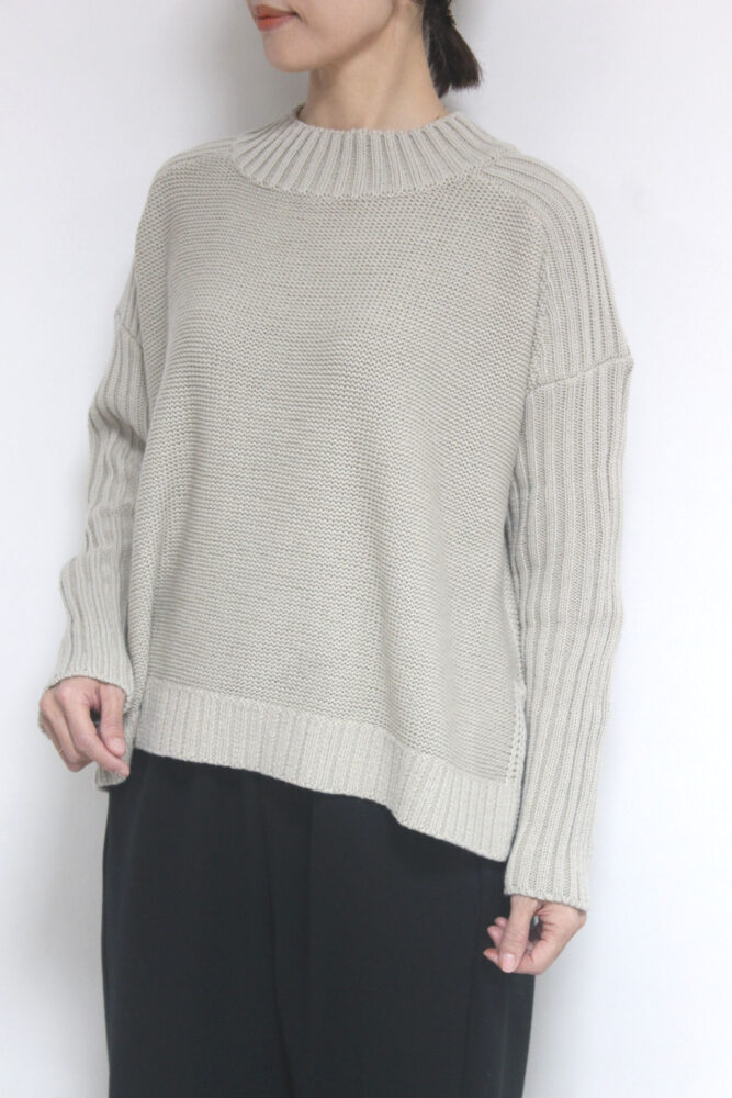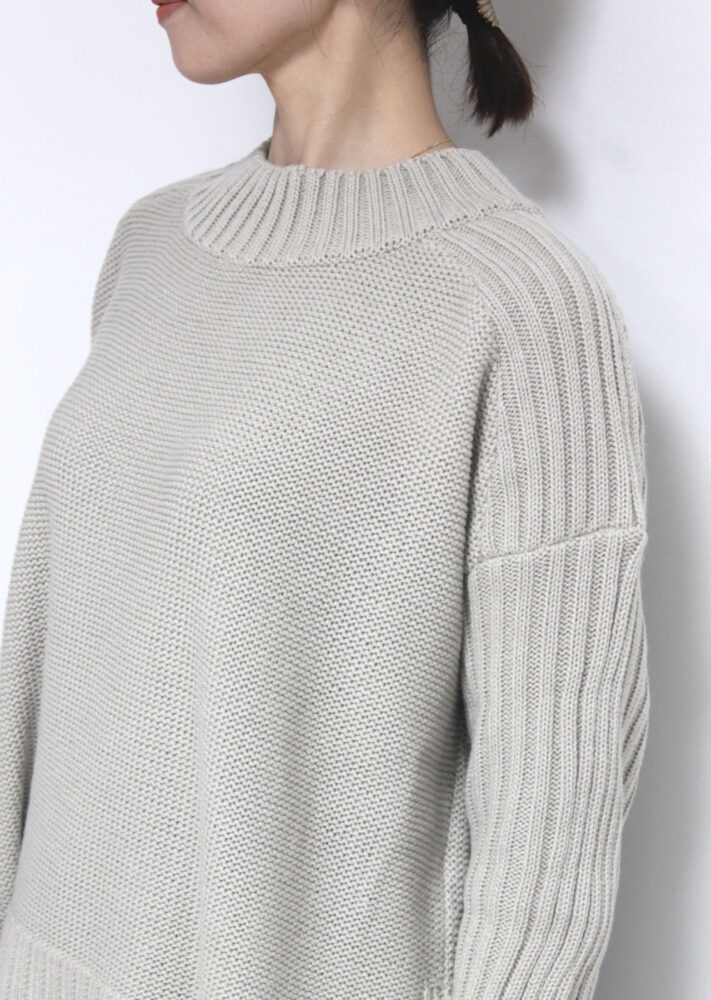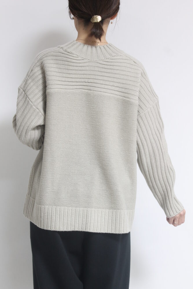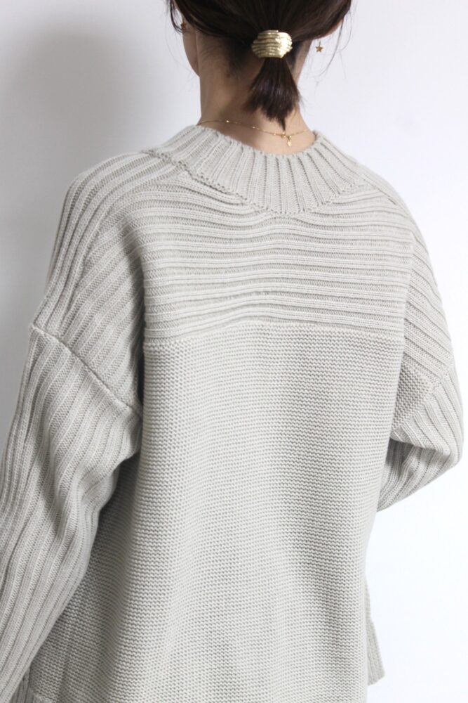 マリードール(MARIED'OR)5Gウール編地切替ハイネックプルオーバー。前と後身頃は表面が細かな凸凹になった変形の平編み。肩から袖にかけてはリブ編み・・異なる2種類の編地でデザインされています。5G(5ゲージ)という太めの糸を使っているのでザックリした暖かみのあるセーターです◎