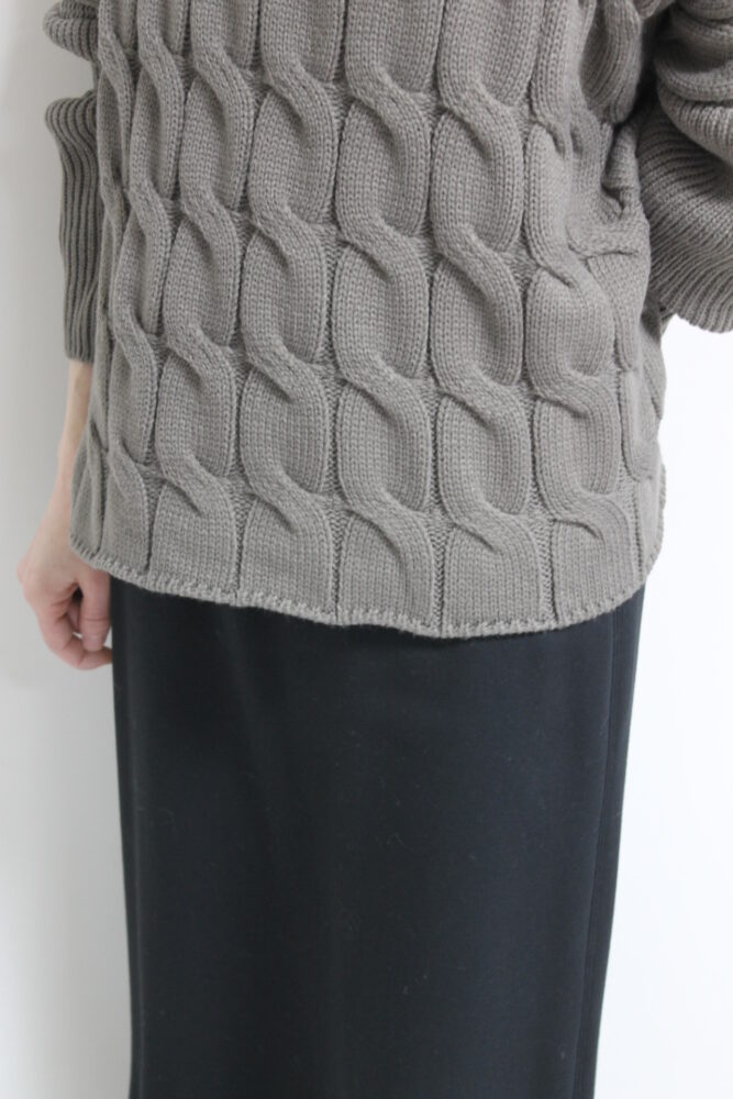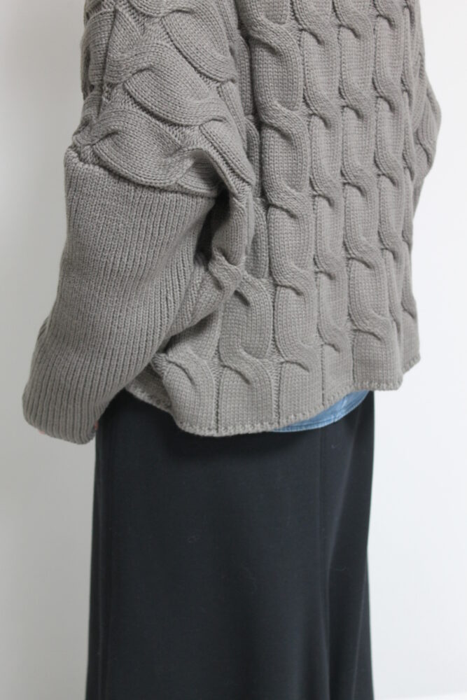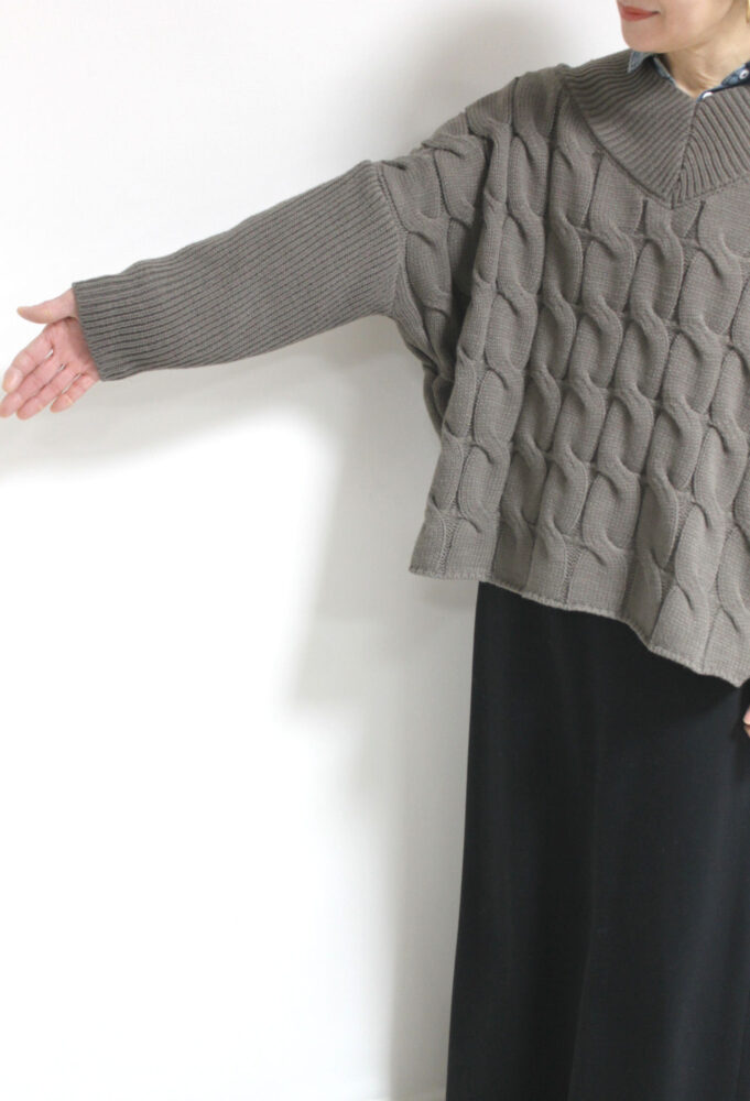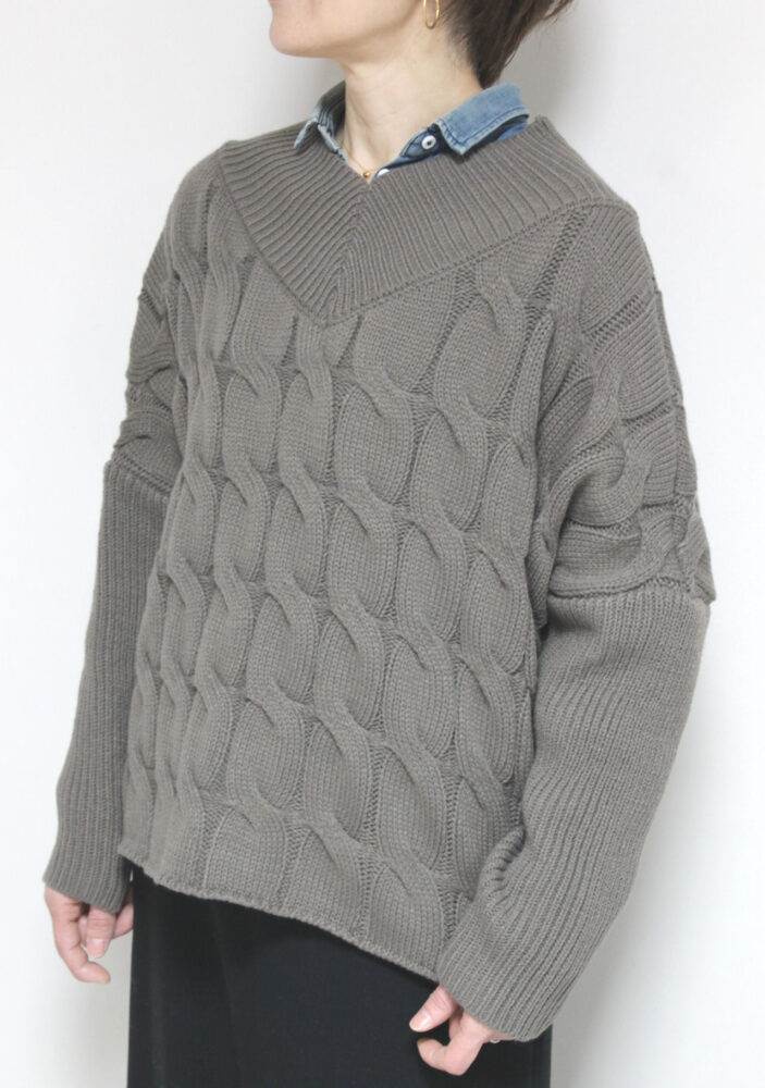 ブランコイブリロ(blanco y brillo)で一番人気のアランケーブル2WAYプルオーバー。ローゲージのざっくり感とV ネック、立体感のある編地がとっても上品です。肉厚で暖かいので真冬もOK。前と後をひっくり返すと衿ぐりの雰囲気も変わります。ワンランク上の着こなしを叶える主役級ニットです◎