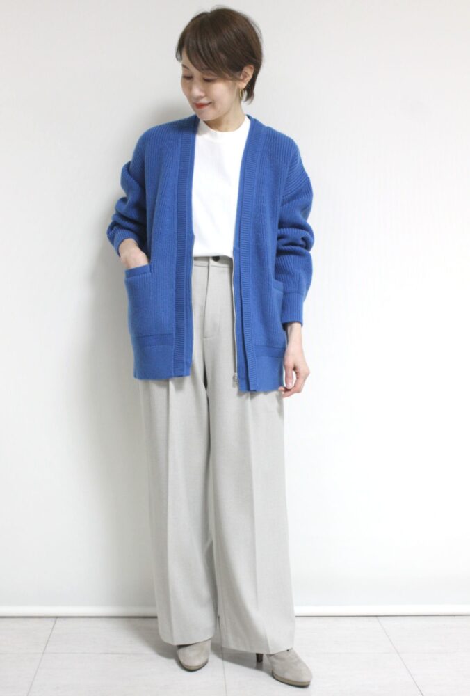 肉厚でありながら軽やかなディニテコリエ(Dignite Collier)ジップニットカーディガン。しっかりとした肉感とモチモチした触感で着心地が◎。大きめのポケットが付いていて羽織りやすい。外だけでなく室内でも着ていただけるサイズ感です。