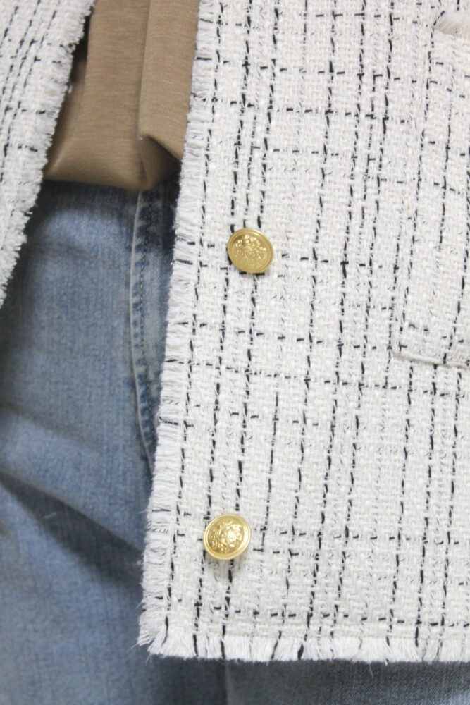 ディニテコリエ(Dignite Collier)ツィードジャケットはオケージョンからオフスタイルにデニム合わせでカジュアルダウンさせるスタイリングもおすすめ。何種類かの糸を組み合わせて仕上げたこだわりのツイードで金ボタンがアクセント。衿ぐりや袖口、裾に配されたフリンジがこなれ感を演出してくれます◎