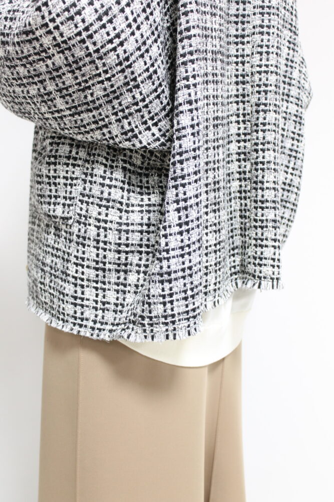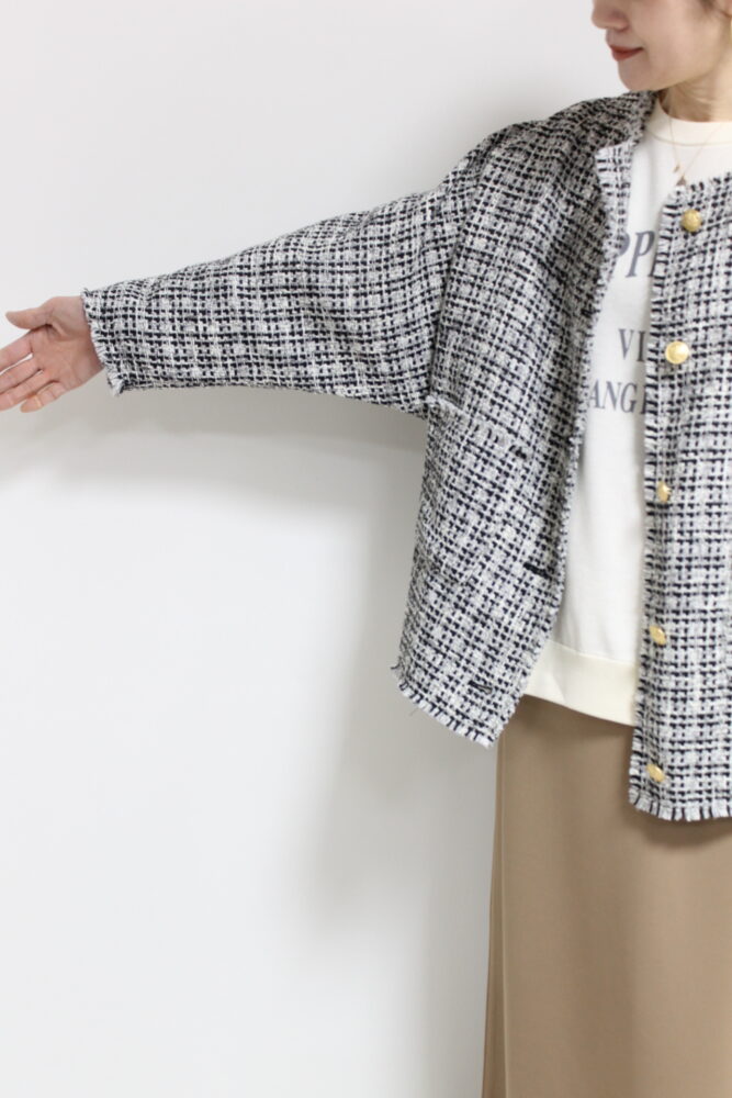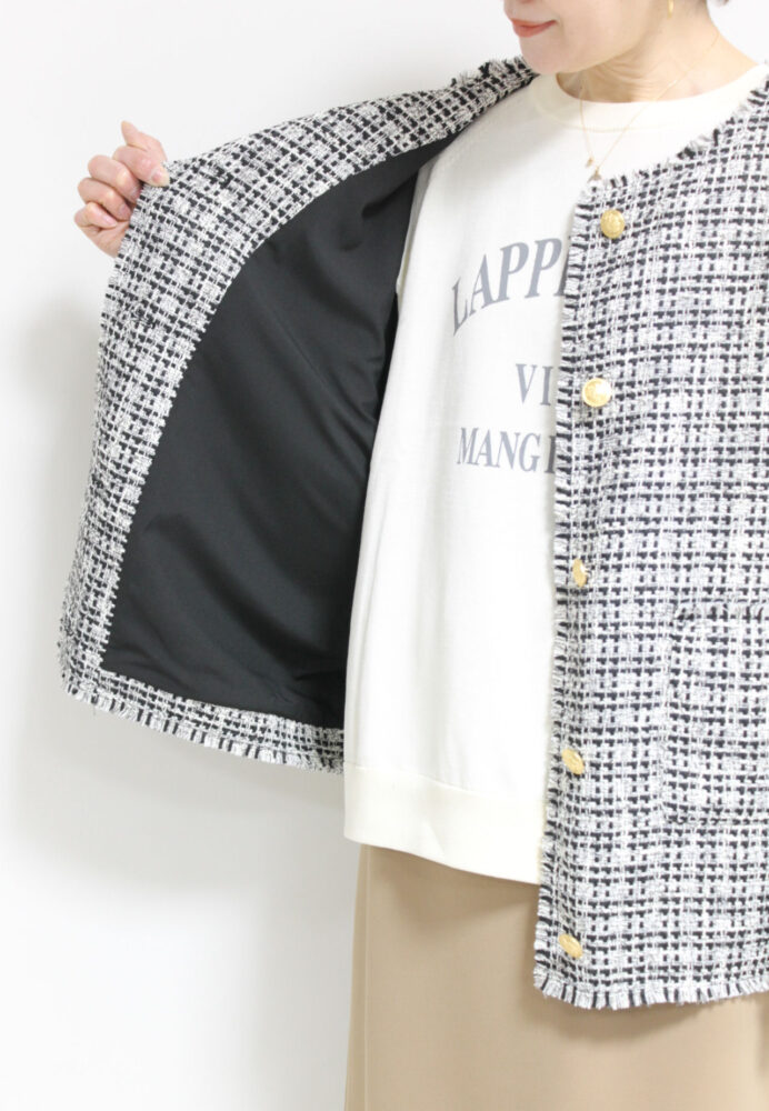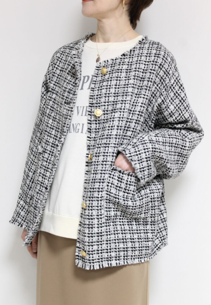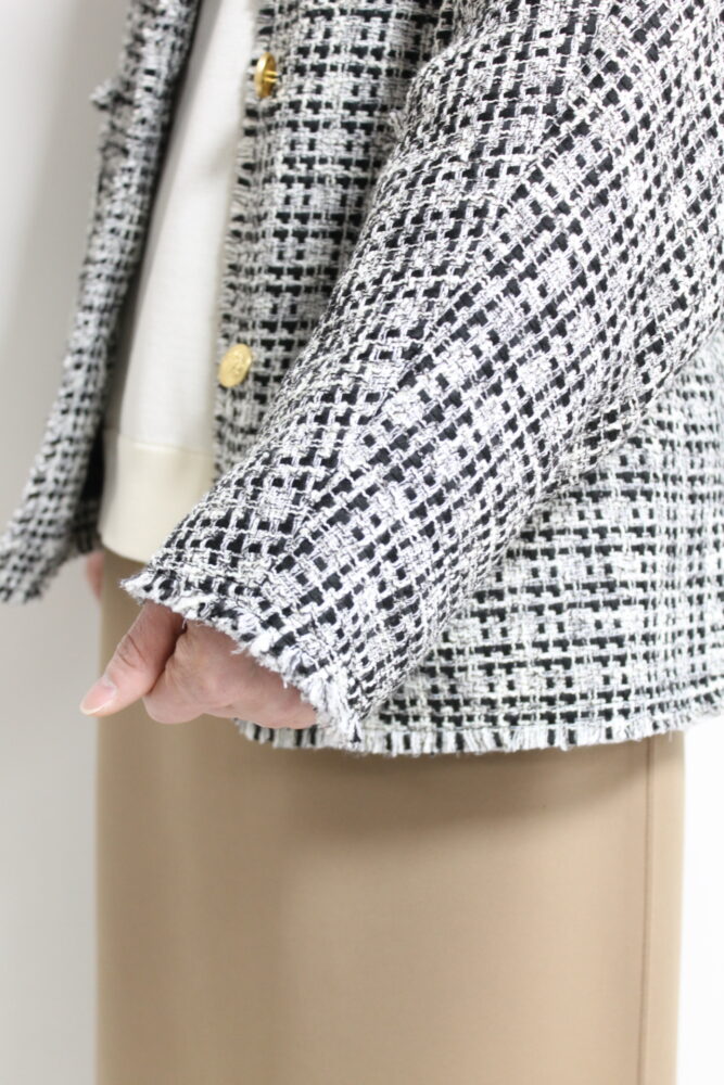 ディニテコリエ(Dignite Collier)ツィードジャケットはオケージョンからオフスタイルにデニム合わせでカジュアルダウンさせるスタイリングもおすすめ。何種類かの糸を組み合わせて仕上げたこだわりのツイードで金ボタンがアクセント。衿ぐりや袖口、裾に配されたフリンジがこなれ感を演出してくれます◎
