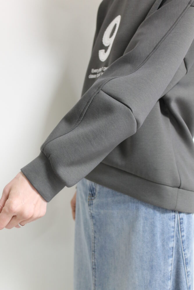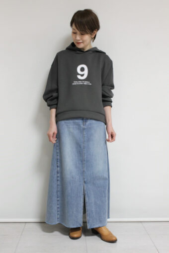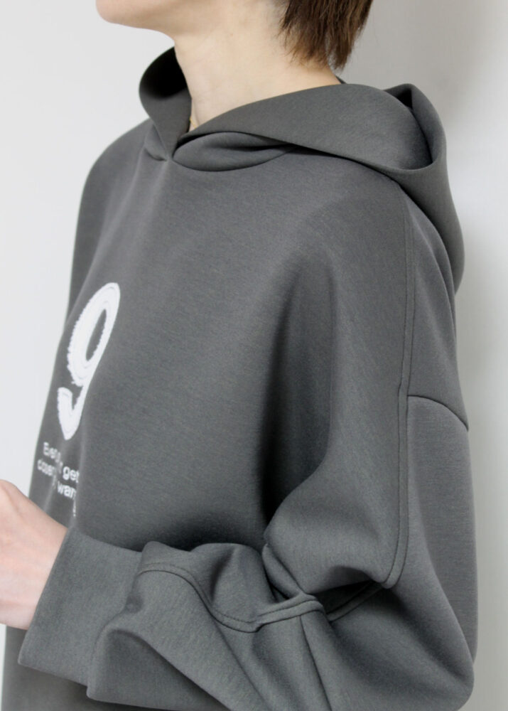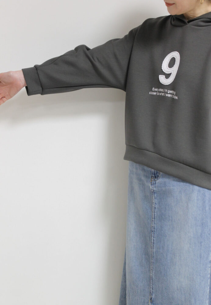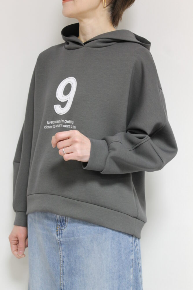 肌寒さが残るこの時期にうれしいディニテコリエ(Dignite Collier)ボンディング 刺繍 パーカー。表地はスウェット、裏側はカットソーを貼り合わせたボンディング素材で肌触りの良い生地感に仕上げました。フロントの「9」のアップリケが印象的な一枚です◎