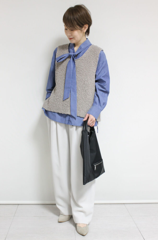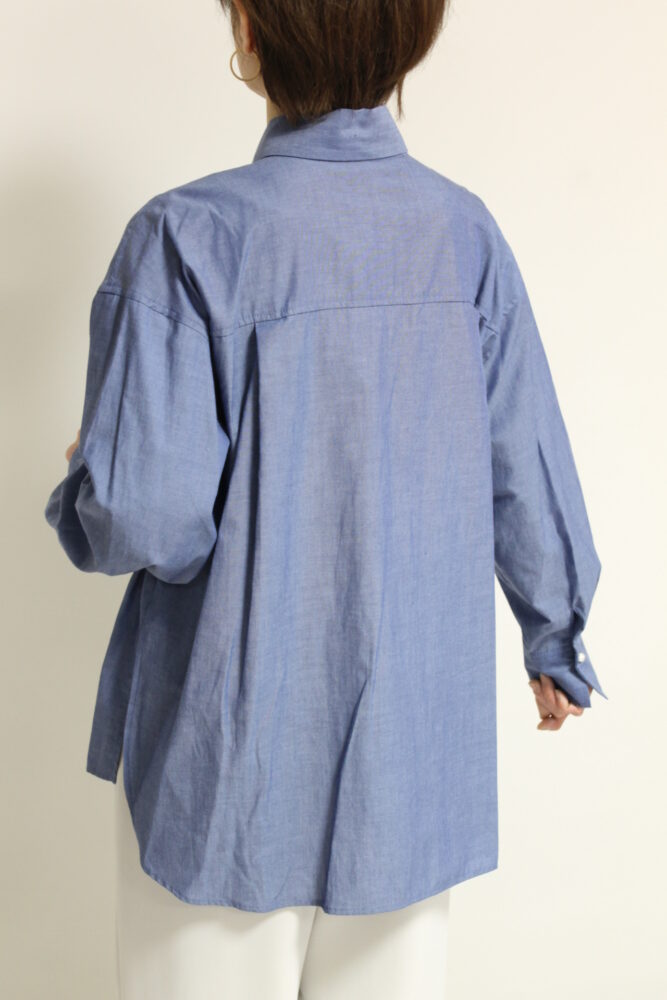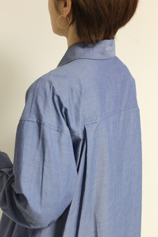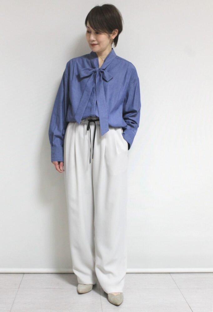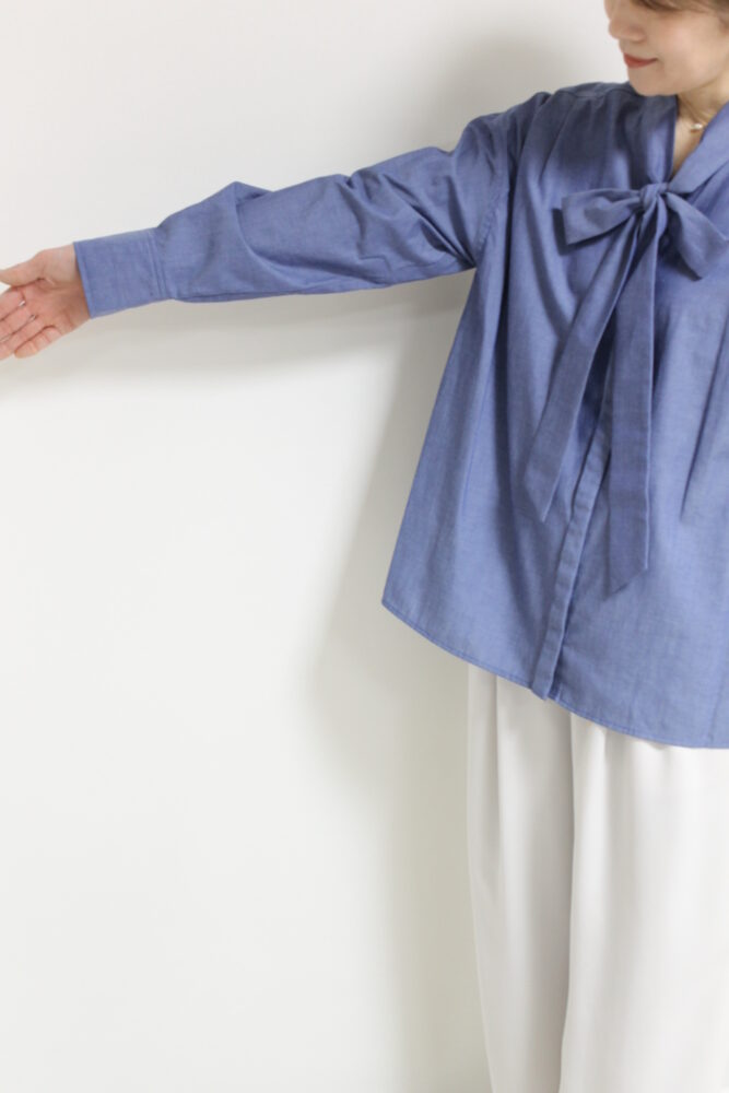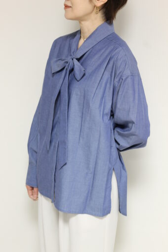 軽い生地のデニムがエレガントになりがちなボウタイデザインをカジュアルダウンしてくれるルクールブラン(le.coeur blanc)ダンガリーシャツ。ボウタイを外してスタンドカラーとしても着ることが出来ます。ポリエステル混でシワになりにくいのもうれしい。シンプルなデザインで着回しが効いてスタイリングの幅が広がる便利なアイテムです◎