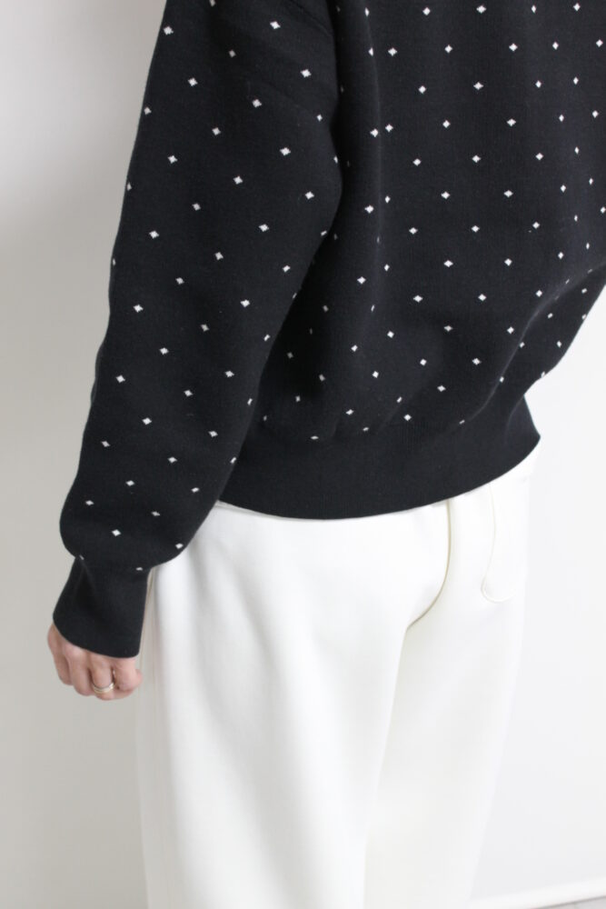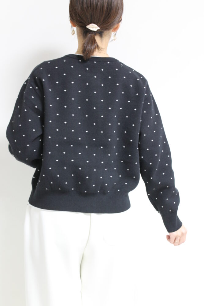 ダブルジャガード編みの小さめドット柄がクラシカルな雰囲気。シンプルなクルーネックデザインはどんなアイテムにも合わせやすく、スカートやワンピースなどフェミニンスタイル、デニムやブラウスに合わせたフレンチスタイルも◎程よい肉厚感で春前から着用できます☆