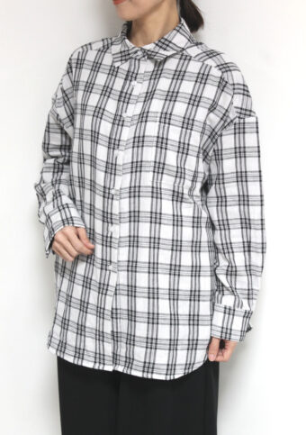 ロージー(ROSIEE)のチェックシャツはダブルガーゼの空気を含んだ軽くてやわらかな風合いで着心地◎。オーバーシルエットですがお袖や裾をブラウジングして着ていただくと収まりよく体型を問わず様々な着こなしに重宝する一枚です。春~真夏の羽織りとしてロングシーズン着用可能。一見メンズライクなシルエットですが女性らしく着られるシャツです。