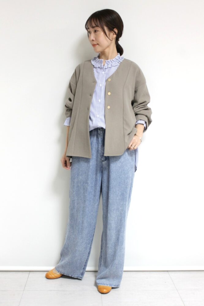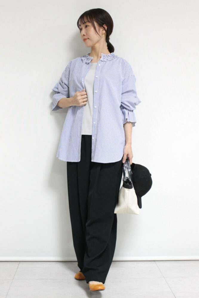 ルクールブラン(le.coeur blanc)のネックまわりに上品なフリルをあしらった華やぎブラウス。前衿は抜け感を演出するスキッパーデザインで、甘さを抑えた大人バランスに仕上げました。ニットと重ねたときにフリルが可愛く見えるよう、衿ぐりの開きやフリル幅も計算。長めの袖丈はレイヤード時にちょうど覗き、袖口ゴムが入ったキャンディ―スリーブで1枚着でも丈調整が可能。着回し力の高い一枚です◎