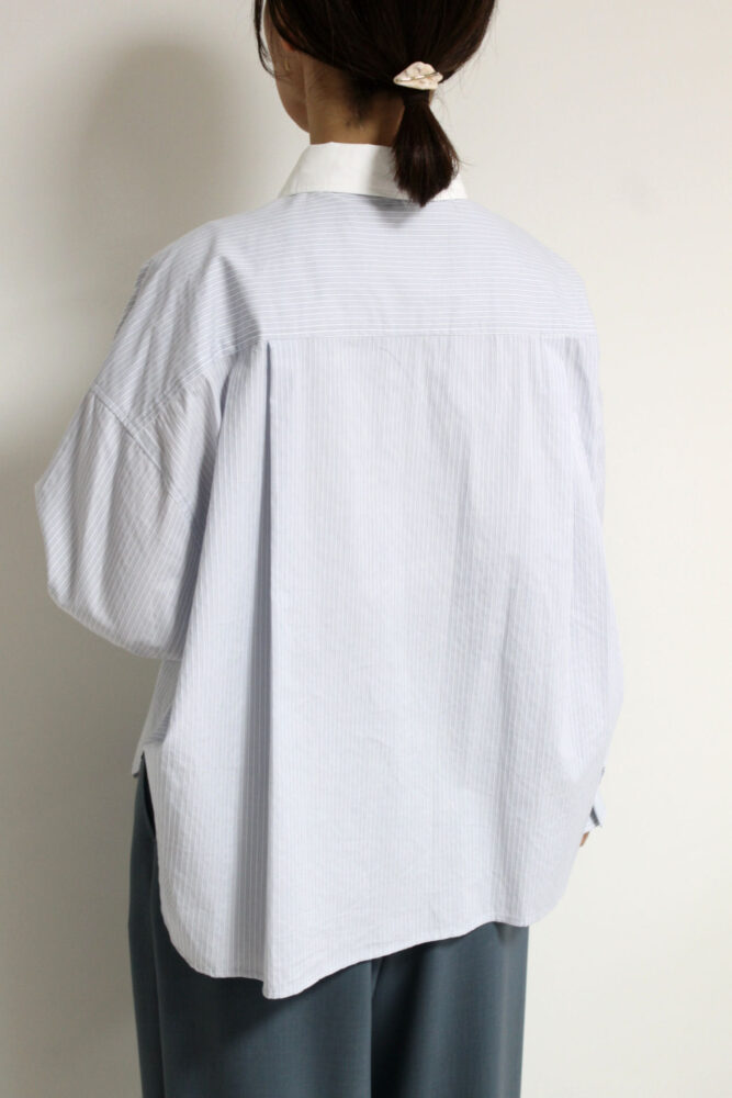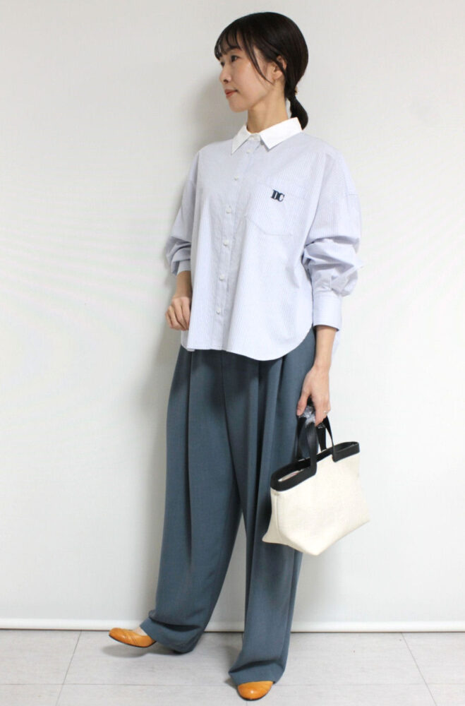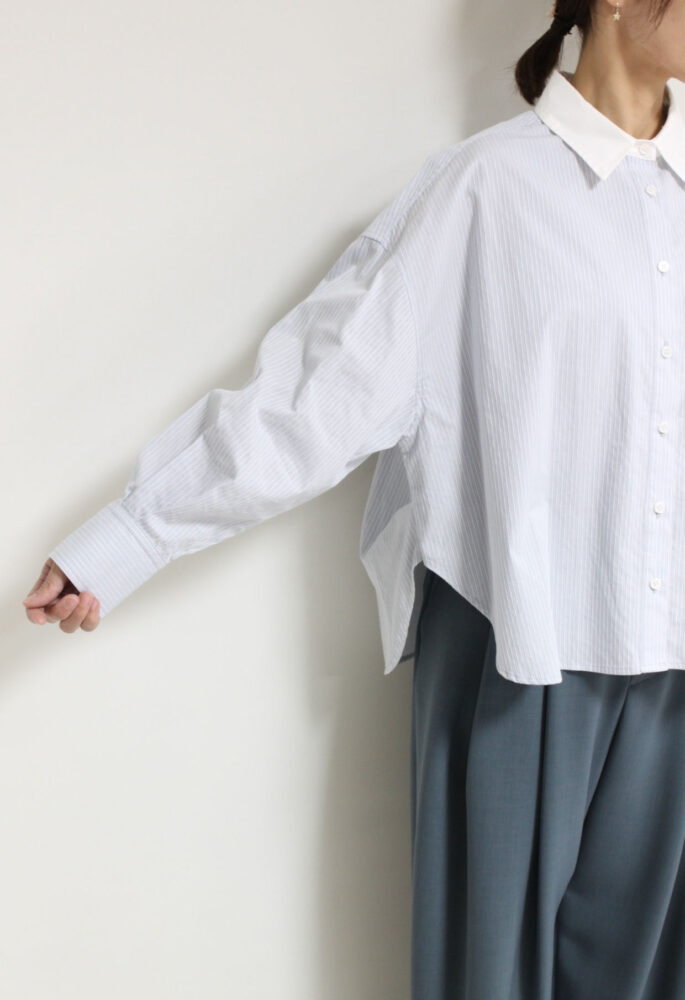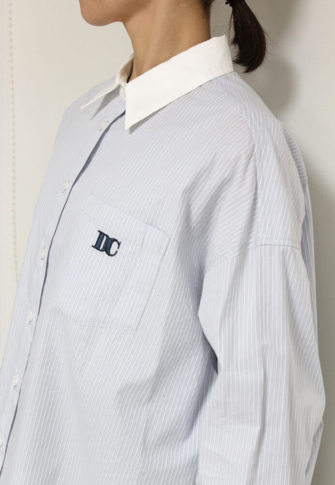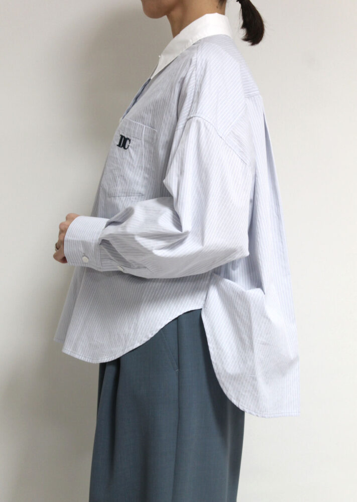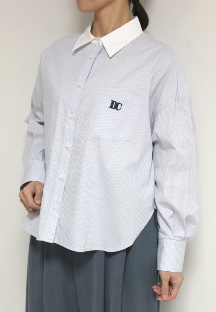 爽やかな印象を与えるディニテコリエ(Dignite Collier)のストライプ柄のクレリックシャツ。胸元にはブランドを象徴する刺繍をあしらい、さりげないアクセントに。コンパクトなショート丈でバランスが取りやすくハイウエストボトムとも好相性。きちんと感がありながら軽やかに着こなせる一枚です◎