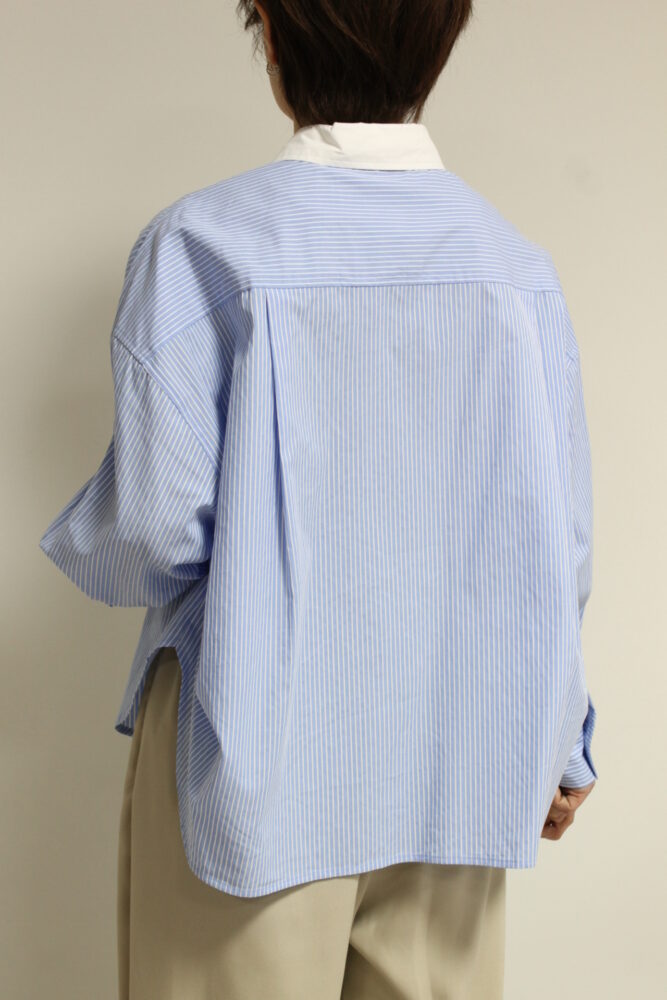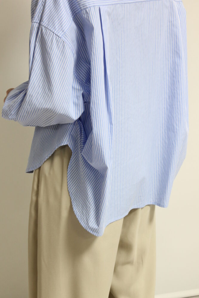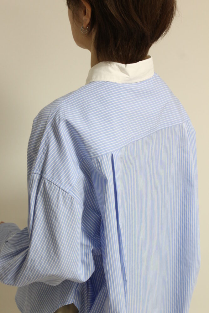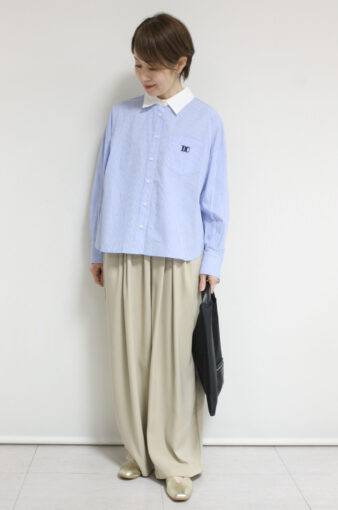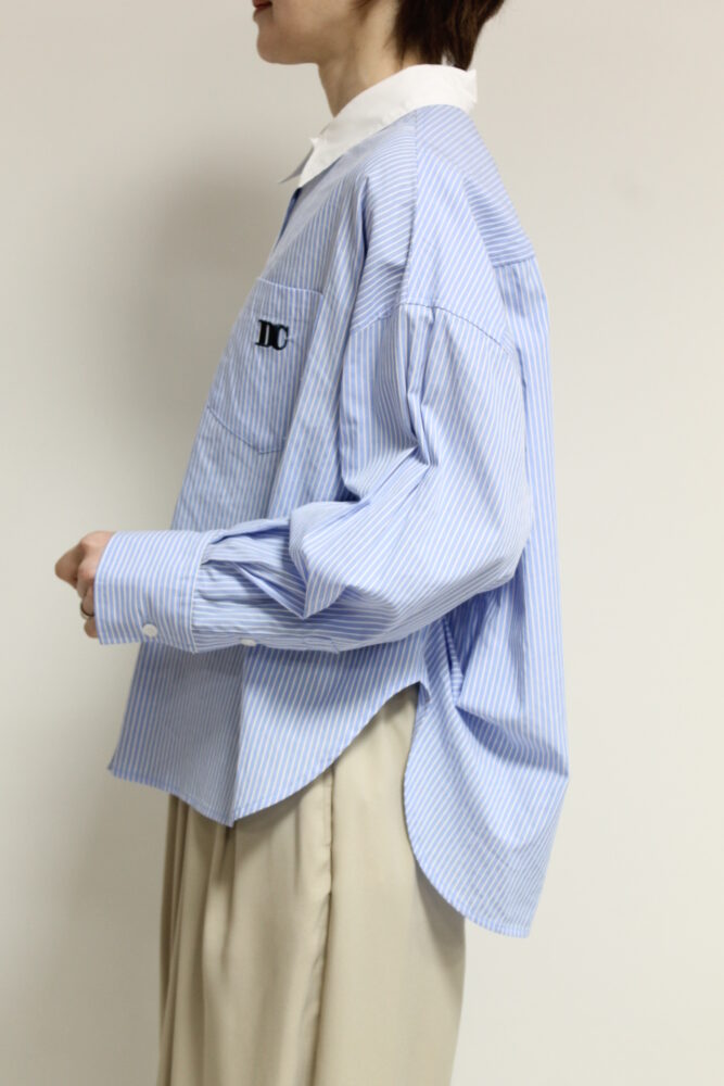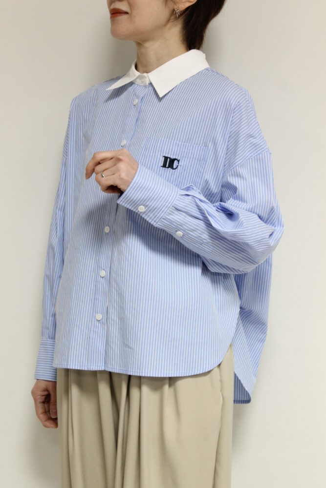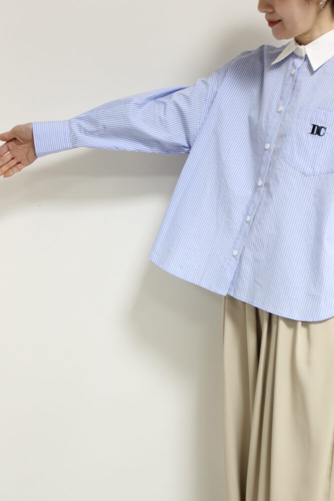 爽やかな印象を与えるディニテコリエ(Dignite Collier)のストライプ柄のクレリックシャツ。胸元にはブランドを象徴する刺繍をあしらい、さりげないアクセントに。コンパクトなショート丈でバランスが取りやすくハイウエストボトムとも好相性。きちんと感がありながら軽やかに着こなせる一枚です◎