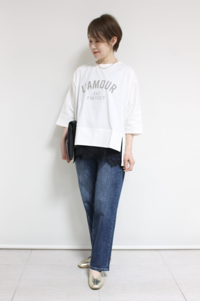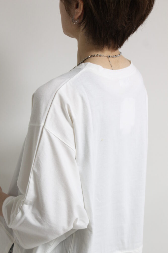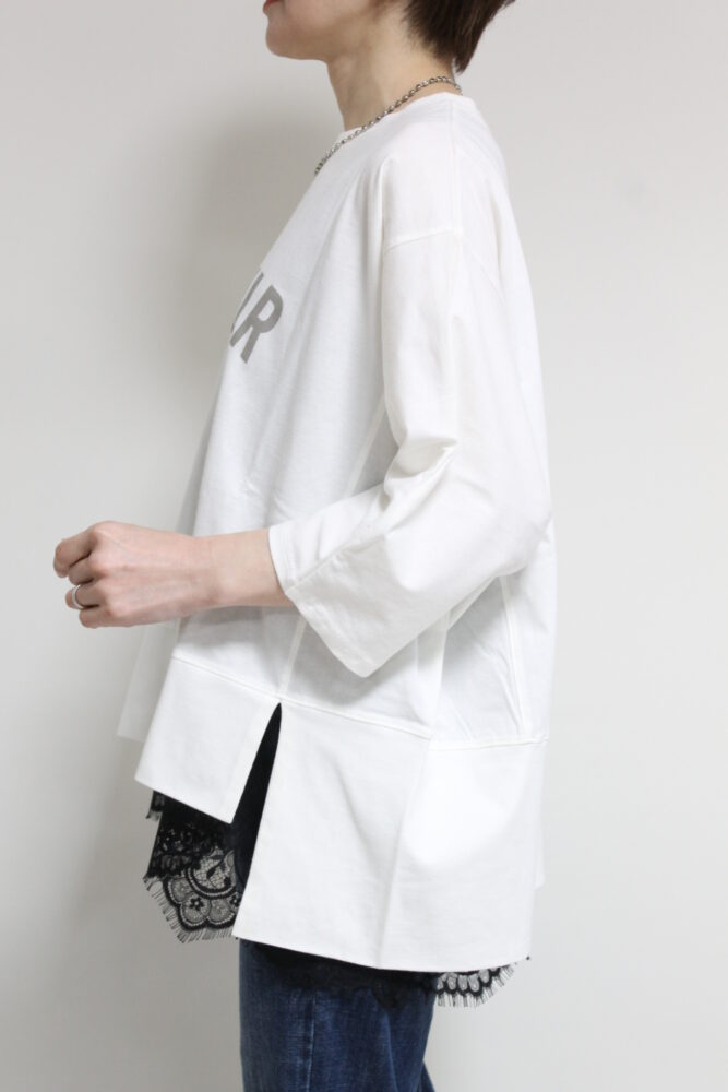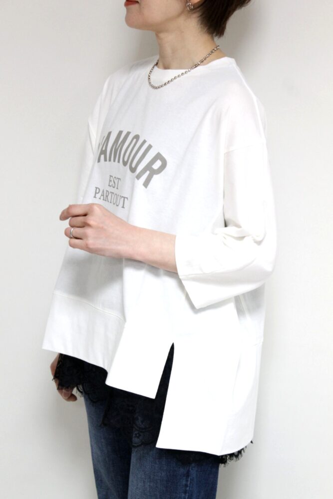 シロデボランテ(siro de labonte)7分袖ロゴデザインプルオーバー。少し厚みのある、しっかりとしたカットソー生地。くっきりとしたロゴがスタイリングのアクセントになり、一枚でサマになる5分袖トップスです。前後差のある前振りデザインで動きのあるシルエットに仕上がり着るだけでこなれた印象に。季節の変わり目にも使いやすい、頼れる一枚です◎