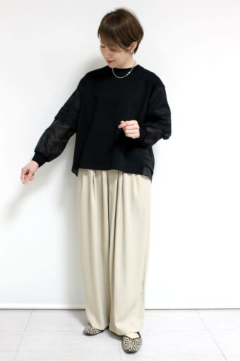 袖にタックとハシゴレースをあしらった、表情のあるアンカルネ(Un carnet)の人気デザイン。袖先には透けすぎないシアー素材を使い、軽やかさと大人の着やすさを両立しています。前身頃はストレッチの効いたカット素材で着心地も◎。後ろは下半分を布帛で切り替えたデザインで、さりげないアクセントに。シンプルなボトムに合わせるだけで、いつものコーデに自然な変化が生まれる一枚です。