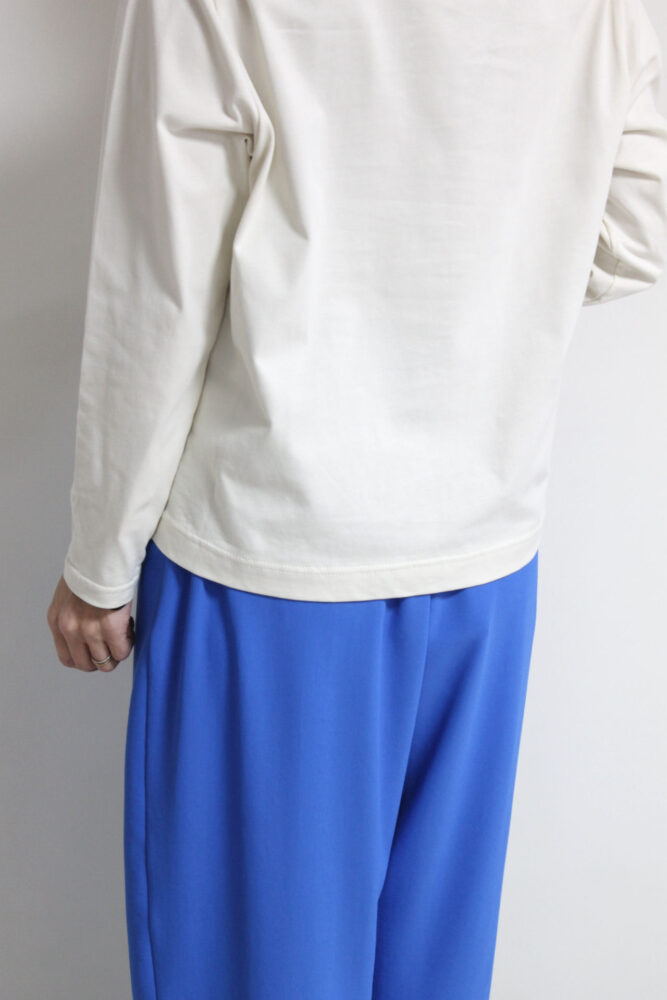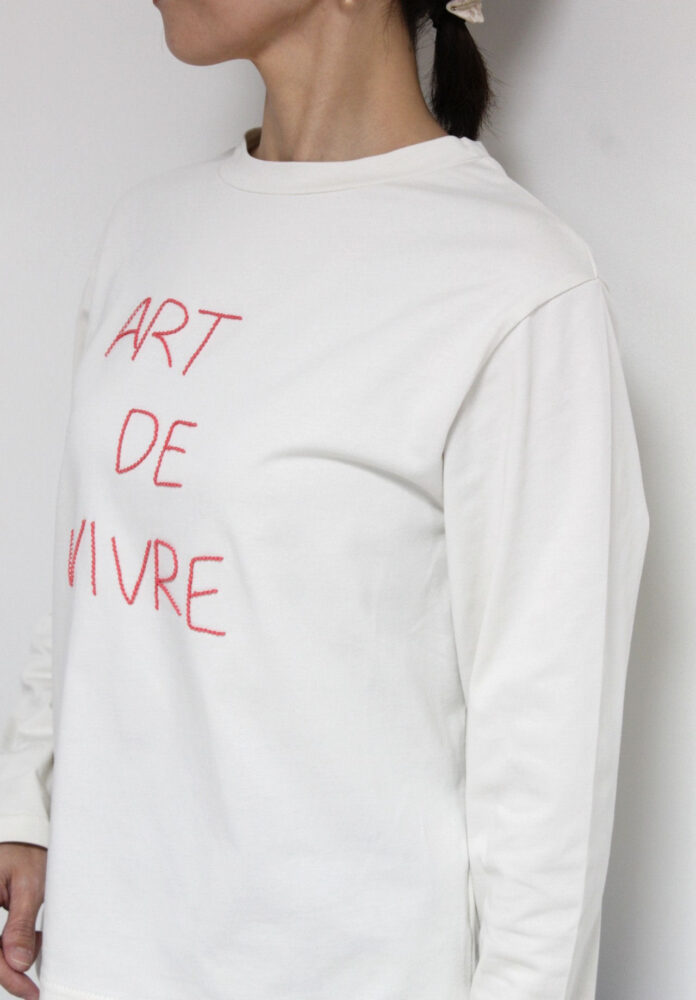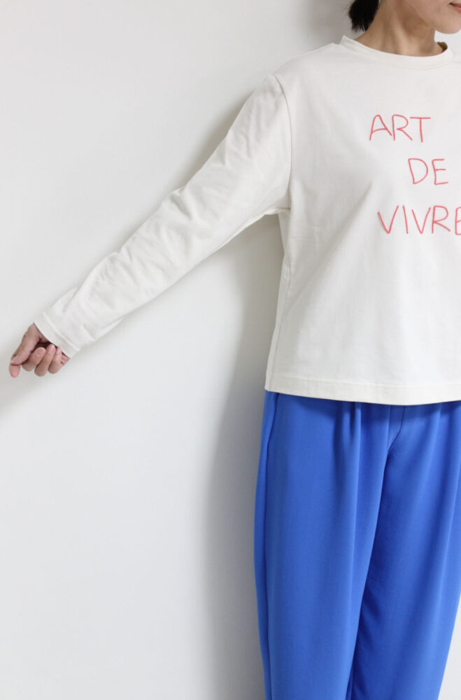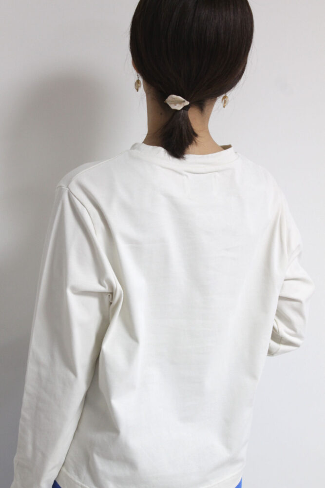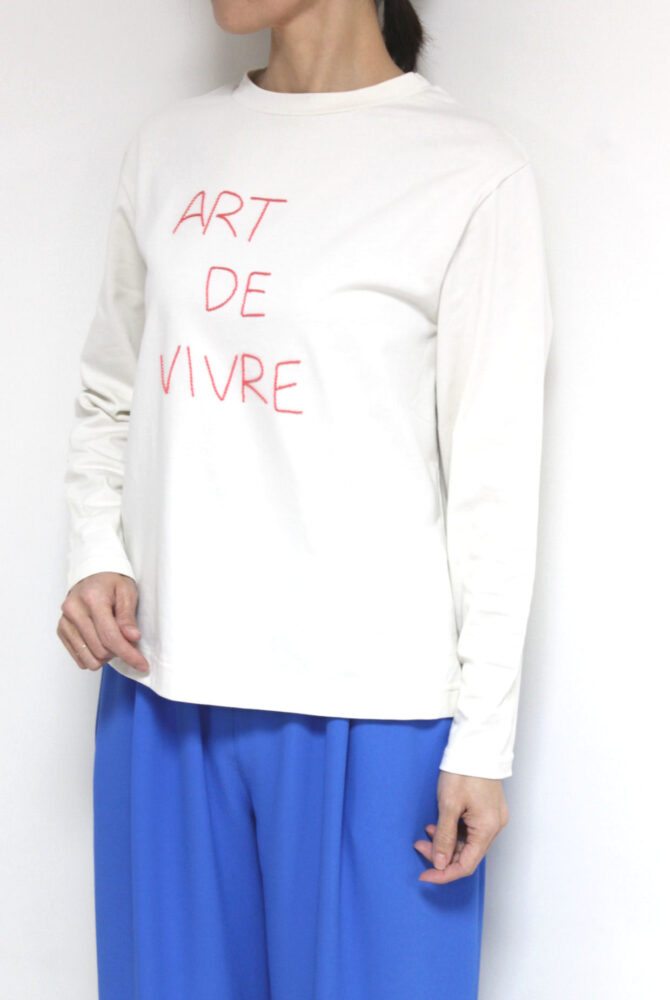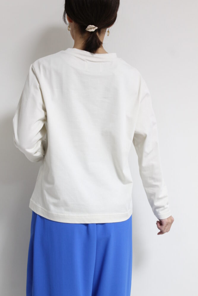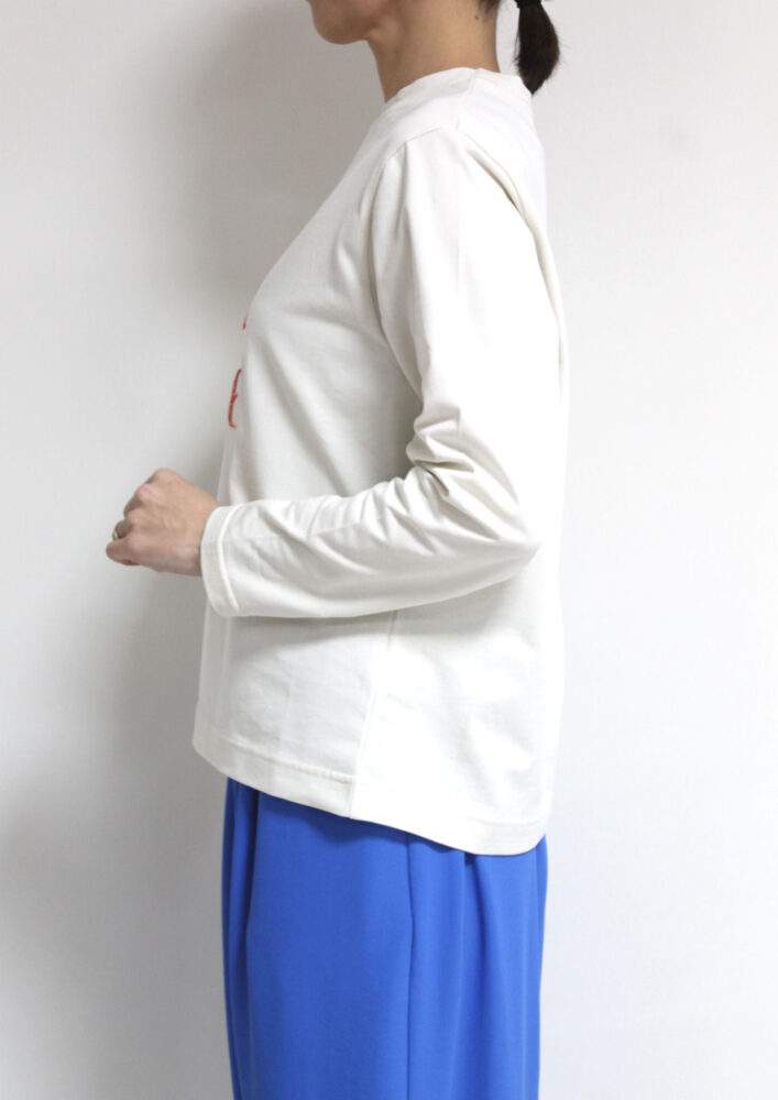 マリードール(MARIED'OR)手書きループ飛び刺繍ロゴ長袖プルオーバーは、程よく肉感があり表情がきれいで透けにくい高級感のある素材を使用。身頃に手書きロゴをループになった刺繍で施したさりげない遊び心と控えめなフォントで上品見えするロゴT。オーバー過ぎないサイズ感でインナーとしても一枚でもすっきり着られます。