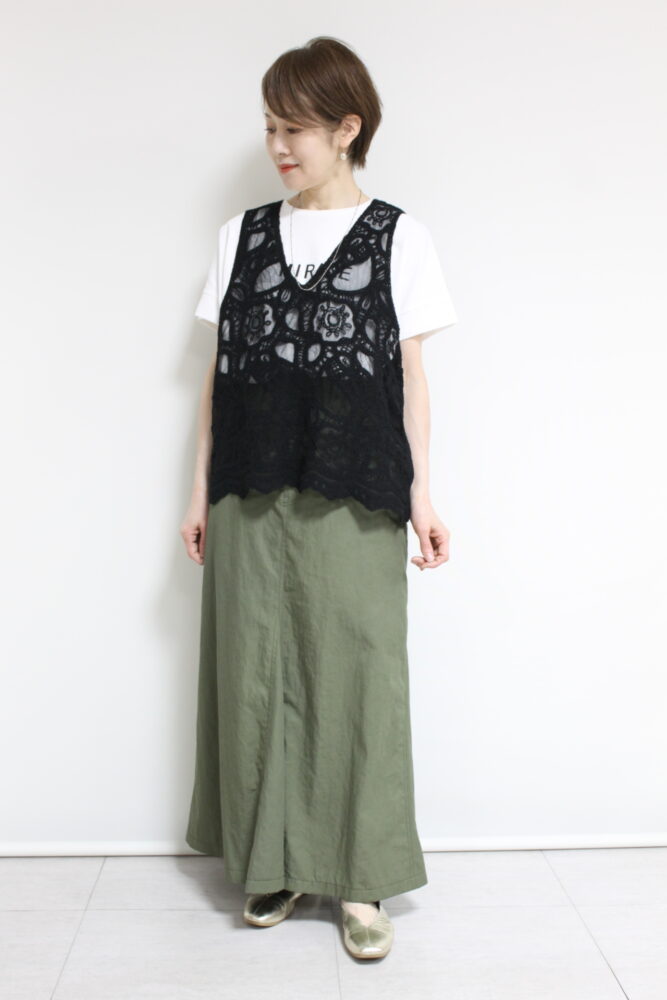 シンプルなTシャツに重ねるだけで、いつものコーデが一気に華やぐアンカルネ(Un carnet)のレースベスト。大人っぽい黒レースで取り入れやすい一枚です。深めのVネックで顔まわりはすっきり、裾のスカラップがやさしく揺れて女性らしさもプラス。パンツにもスカートにも合わせやすく、着こなしに“華やぎ”を添えてくれる、今季おすすめのレイヤードアイテムです✨