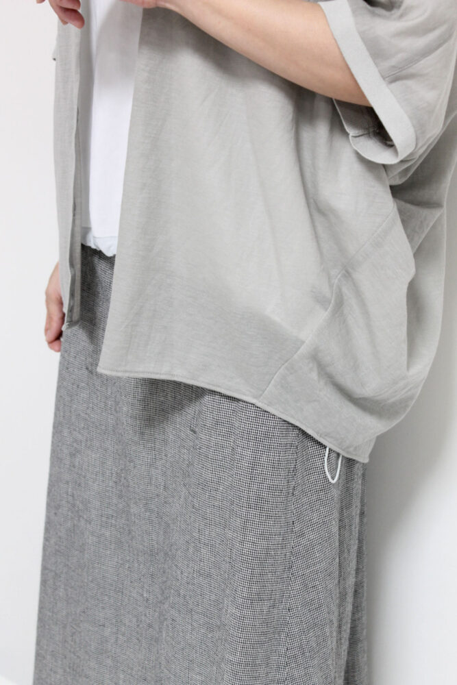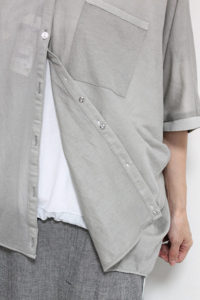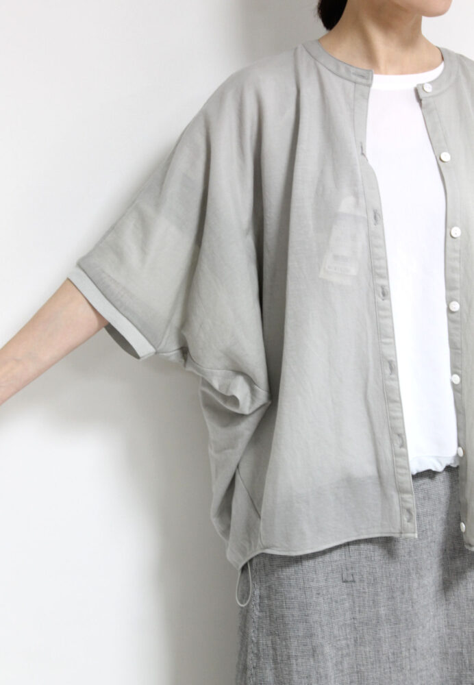やわらかなシアー天竺が生み出す、軽やかな抜け感が魅力のアンカルネ(Un carnet)ドルマンシャツ。体のラインを拾いにくいゆったりシルエットで、さらっと着るだけで大人のこなれ感を演出します。これからの季節は羽織としても活躍。日常に自然と馴染む着映えアイテムです◎(裾を内側に巻き込み、ボタンの後ろ側に付いたスナップを留めることで丈の形を調節できるようになってます)