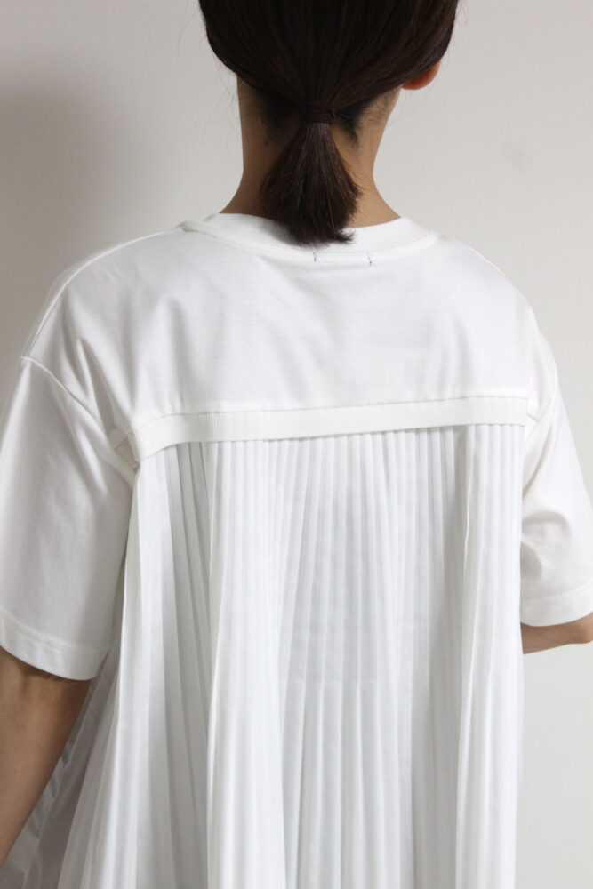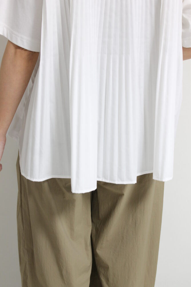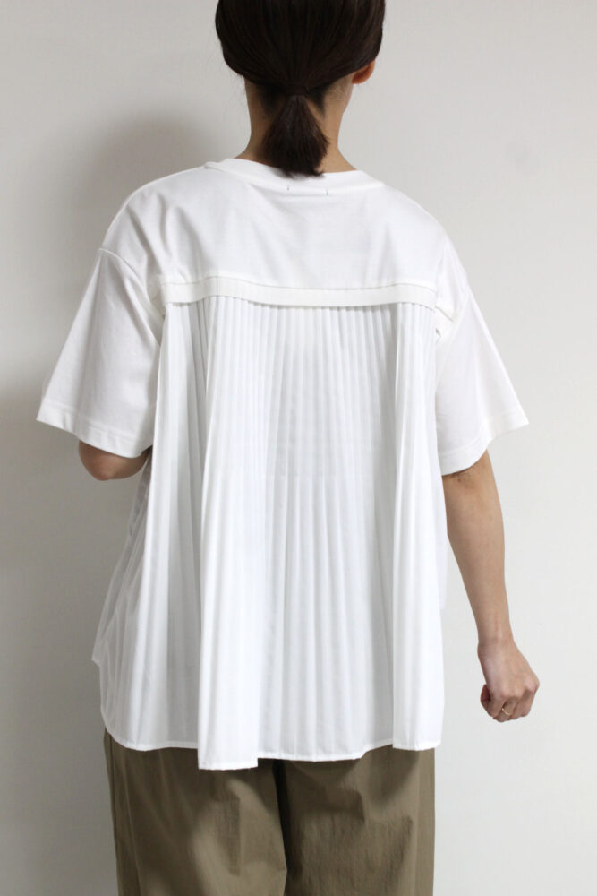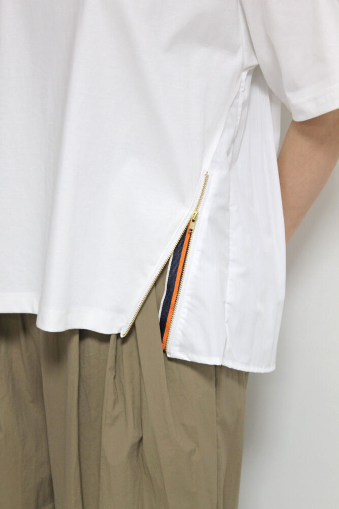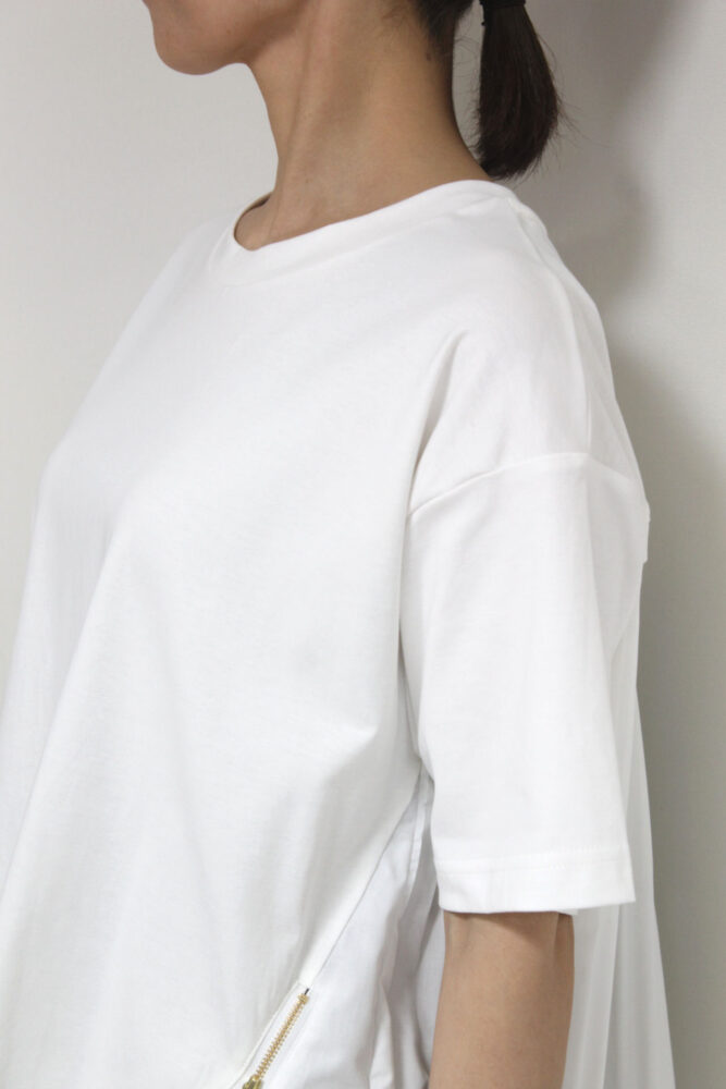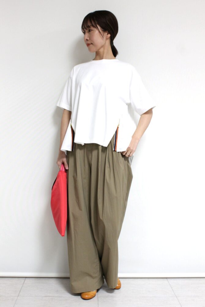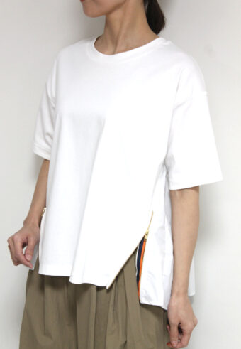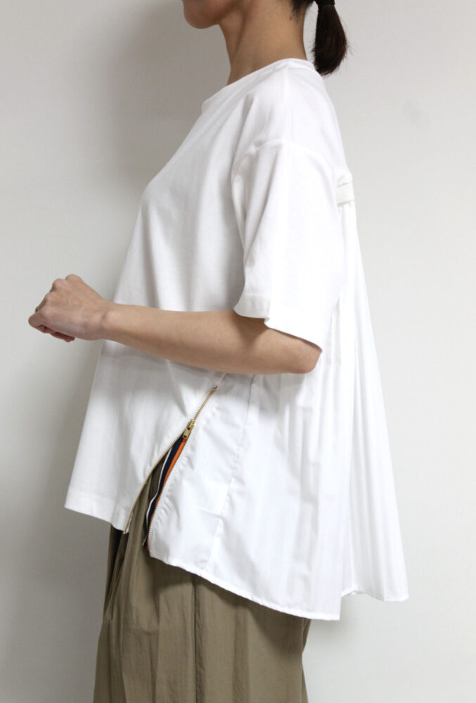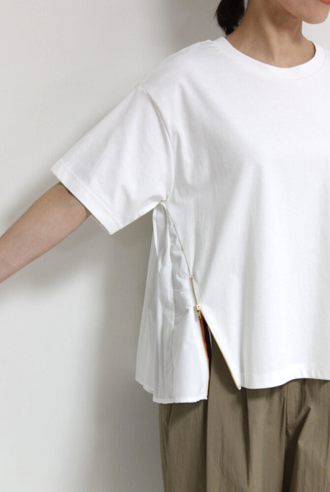 アンカルネ(Un carnet)より入荷。斜めに入った裾ジップからちらりとのぞく配色が、シンプルな中にひとクセ効いたデザイン。開け具合で見え方を変えられ、着こなしにさりげない遊び心を添えてくれます。後身頃はプリーツ切替えで、歩くたびに揺れる軽やかな表情が魅力。前からはすっきり、後ろ姿は華やかに映える、大人の着映えトップスです。