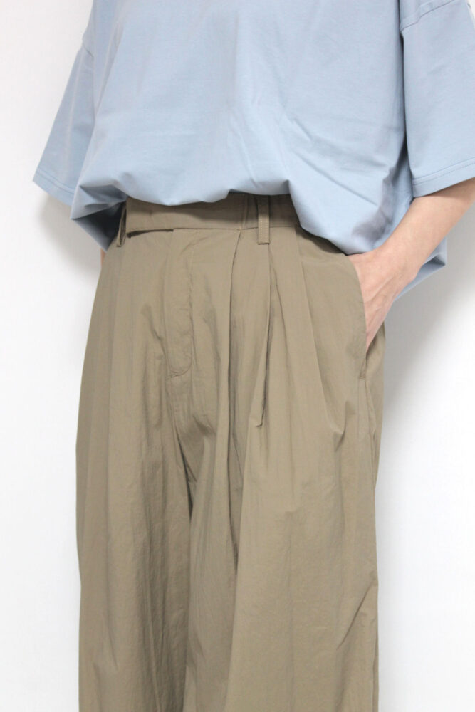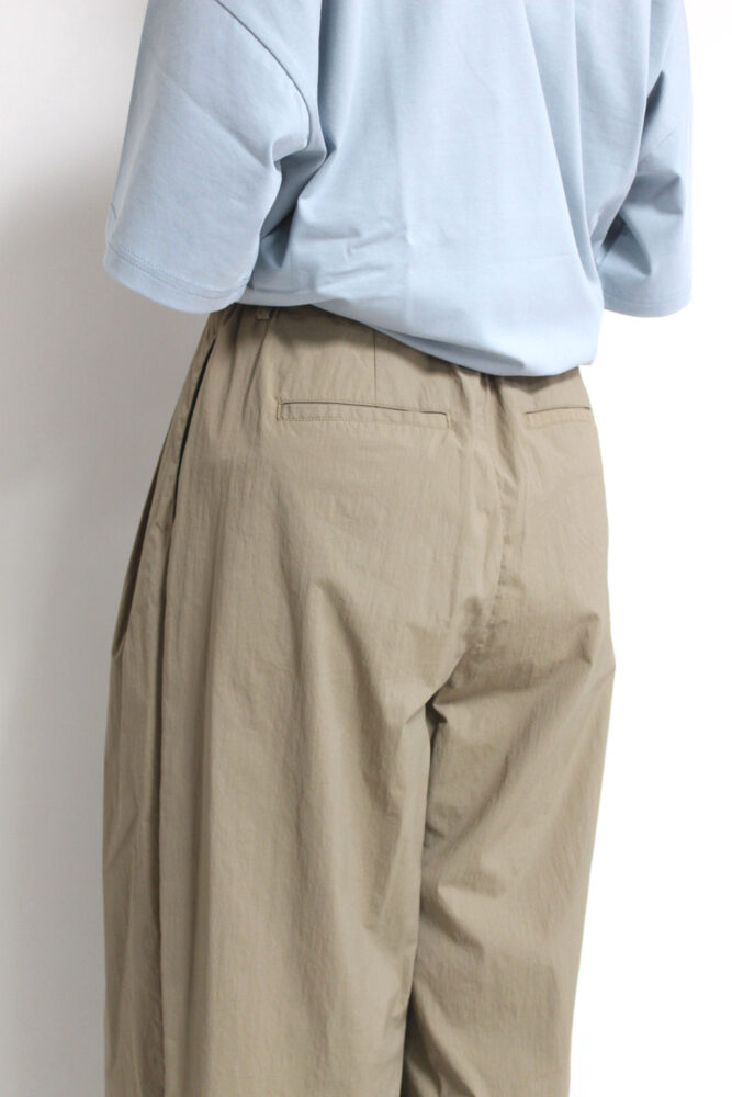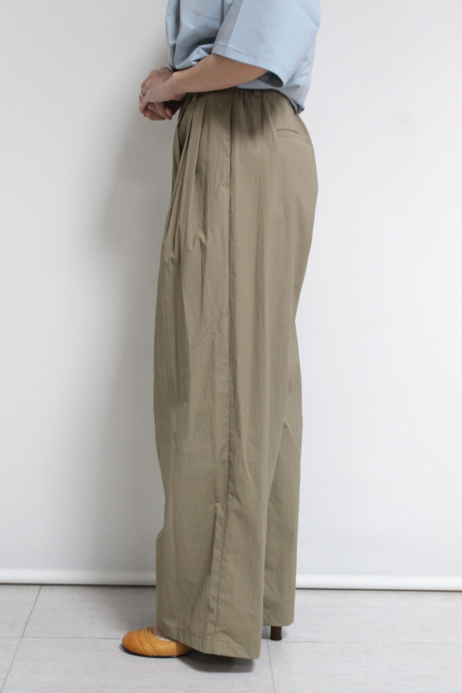 ディニテコリエ(Dignite collier)らしい上品さが際立つ、ハリ感のあるタフタ素材のタックワイドパンツ。立体的で美しいシルエットをキープしながら、フロントタックが腰まわりをすっきり見せ、ゆったり快適な穿き心地を叶えます。軽やかな素材で季節をまたいで活躍し、Tシャツを合わせるだけで大人の洗練カジュアルが完成。体のラインを拾いにくく、着回し力も高いおすすめの一本です◎