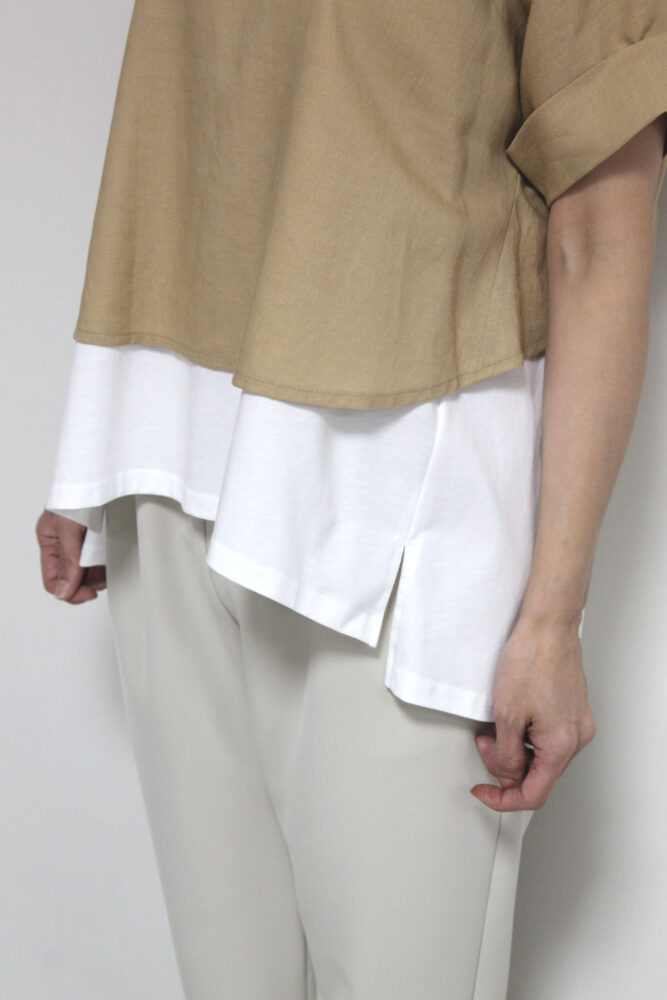 シャツ地のきちんと感とカット素材のラフさを掛け合わせたパシオーネ(PASSIONE)らしい抜け感トップス。一枚で奥行きのある着こなしが完成し、すっきり見えも叶います。重ね着いらずで、暑い季節も快適に楽しめる優秀アイテムです◎