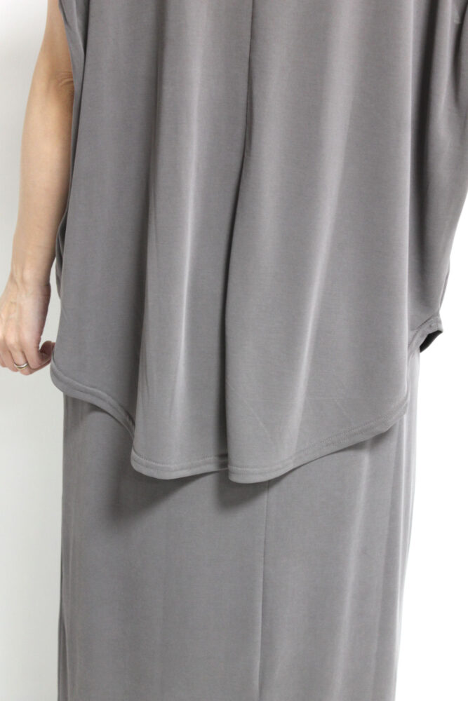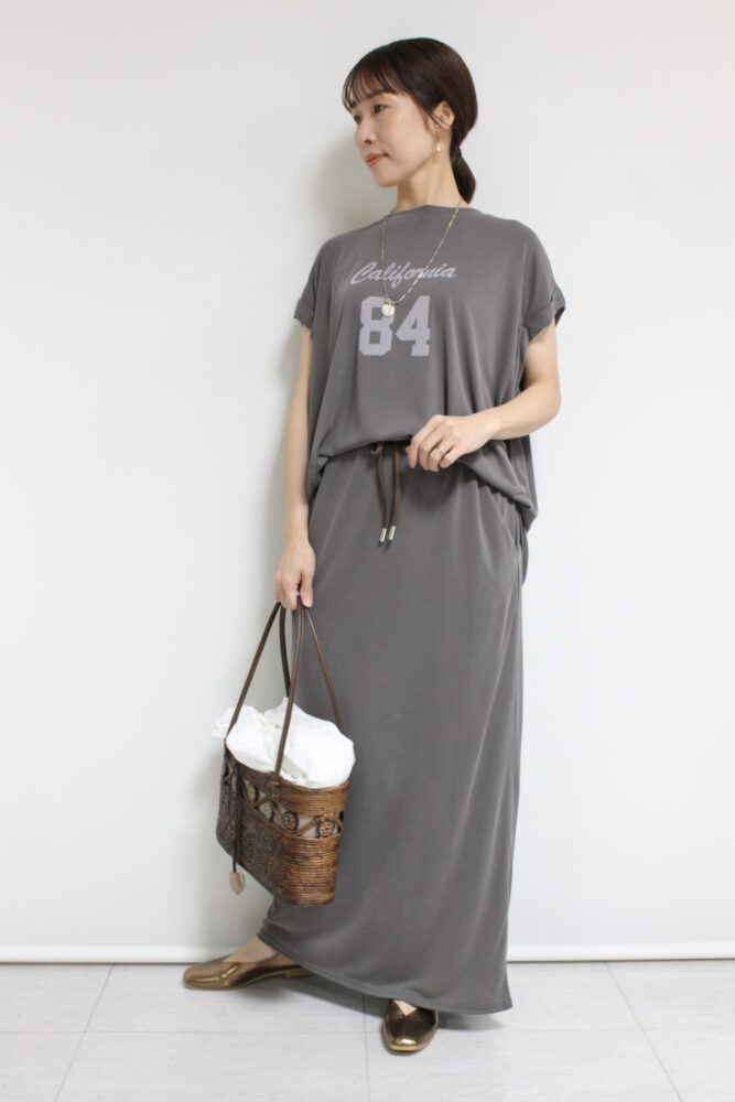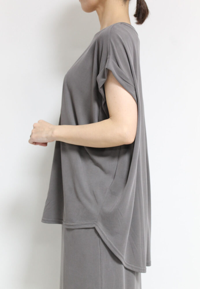 ロージー(ROSIEE)より。とろみのあるモダール素材で触れた瞬間にわかるやわらかさ。落ち感のあるシルエットが体のラインを拾わず、ラフなのに女性らしさもキープ。フレンチスリーブで肩まわりもすっきり見え、ロゴが程よいアクセントに。同素材のボトム(R810305)と合わせてセットアップ対応も可能。上下で揃えればリラックス感がある大人のワンマイルスタイルが完成します。単品でもセットでも着回しが効く頼れる一枚です◎