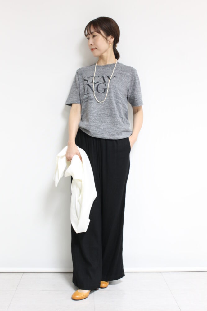 ディニテコリエ(Dignite Collier)STAYNGプリントTシャツは無地より表情があり、柄ほど主張しすぎない“ちょうどいいバランス”。アシンメトリーに配置されたロゴが、さりげなく心をくすぐります。杢ならではの奥行きある風合いで、シンプルながら一枚でサマになる存在感。ほどよくゆとりのあるシルエットで着心地も快適、デイリーに頼れる一枚です◎